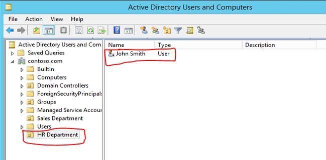 the command i will use to demonstrate this will be dsmove "CN=John Smith,OU=Sales Department,DC=contoso,DC=com" -newparent "OU=HR Department,DC=contoso,DC=com" , it will move the user John Smith from Sales Department OU to HR Department OU. Lets check the object before move.