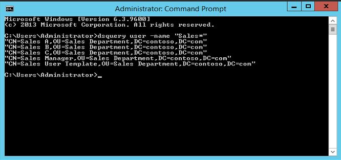 as first query i am going to use dsquery user -name "Sales*" This will search for the all the user names which starts with text "Sales" and list them all.